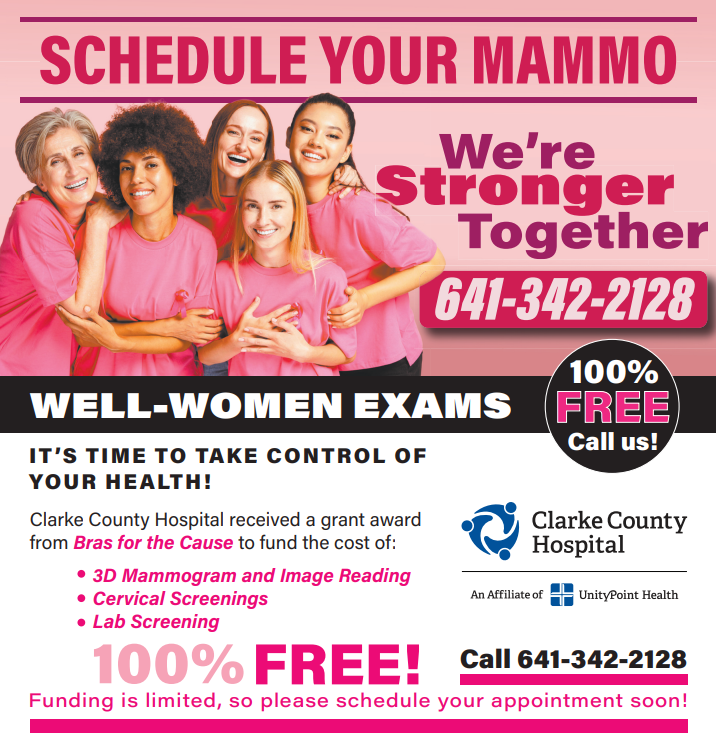Clarke County Hospital is proud to announce the continuation of its free well-woman exam program, made possible through a $5,000 grant from Bras for the Cause. This funding allows the hospital to provide essential preventive screenings at no cost to women who are uninsured or underinsured.